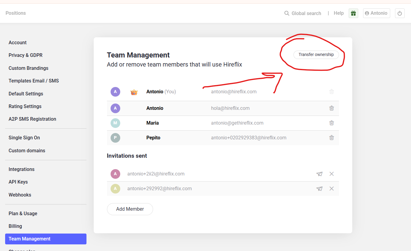 If you ever need to transfer the admin ownership to another team member, you can easily do it from the Team Management section of your account, as shown below.